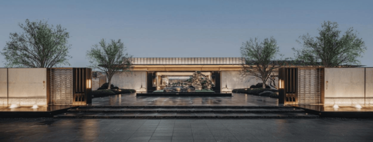 建筑风格:将东方精神与现代建筑相融,取法苏州园林的廊桥框景线条美学,运用质朴拙雅的御窑金砖,提取粉墙黛瓦的江南之色,定制蟒水纹,呈现与众不同的东方韵律和建筑表情。