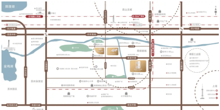 【交通配套】昆山南站直线距离6.5Km、K1线(规划)连接地铁11号线同苏连沪、中环南线,京沪高速、沪常高速等路网纵横