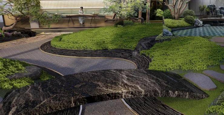该项目以“山水集悦·诗意雅境”为核心理念,规划打造三重归家礼序和“一环三境十二景”的新中式园林,内部景观包含枯山水园林、中式观澜亭、风雨连廊、江南石桥等,更将大量采用红枫、桂花、罗汉松,紫薇、鸡爪槭等名贵树种,呈现出移步异景的精致园林。