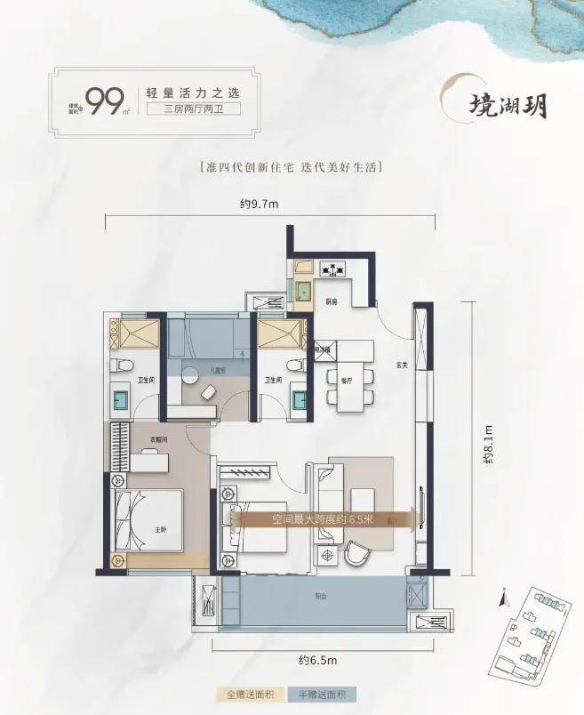 小户型也能做到大尺度:整个南向采光面可达约9.7米,其中双联大阳台开间约6.5米,主卧开间约3.4米等,这些尺度此前基本都是要建面约140平以上的户型方能实现。如今境湖玥在一套建面约99平的小户型上做到了,堪称极品。
