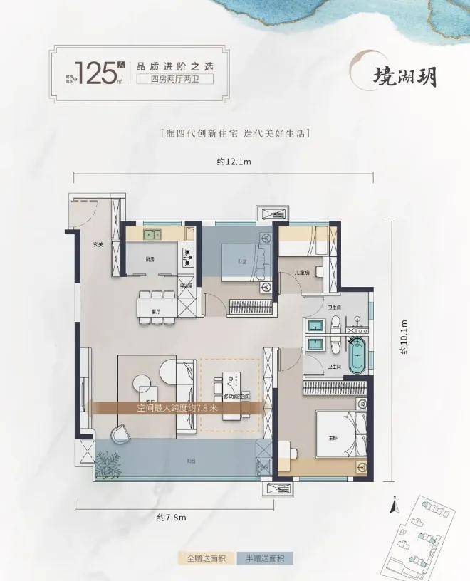 建面约125平,四房两厅两卫: