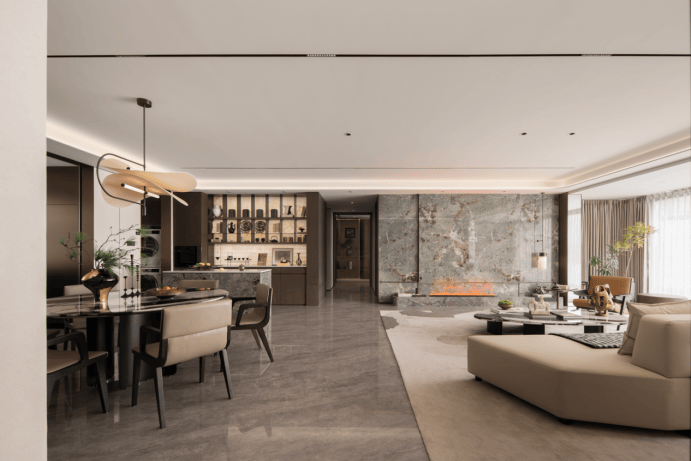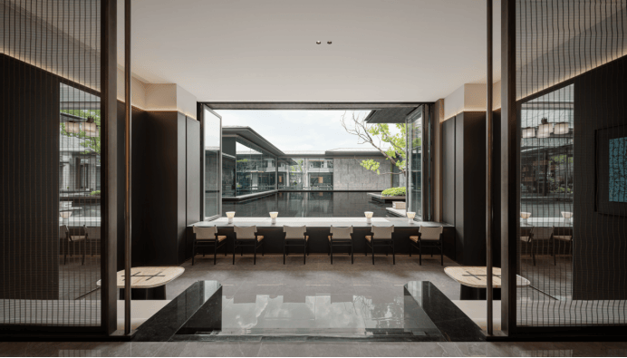 车马院设计:以上海半岛酒店作为灵感来源,采用海鸥丽晶酒店同款的接待门,下挂式的星空顶、艺术雕塑、迎宾叠水以及范思哲黑背景墙相互映衬。