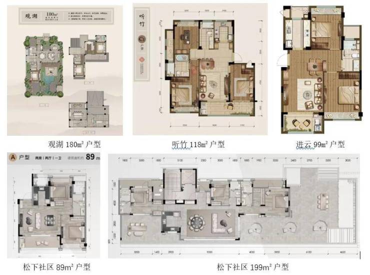 听竹是阳羡溪山一期唯一多层公寓组团,整体风格延续了乌镇雅园的新民国建筑风格。户型包括83 m²的两居和99 m²、118 m²的三居等。其中118 m²的三居产品采用了南向三开间+主卧套间的布局格局,赠送长6.9m、进深1.8m的大面积阳台,主卧和次卧分别赠送飘窗等。