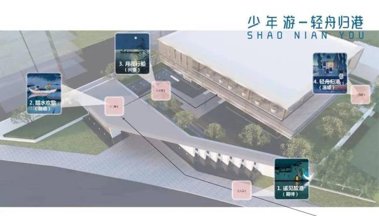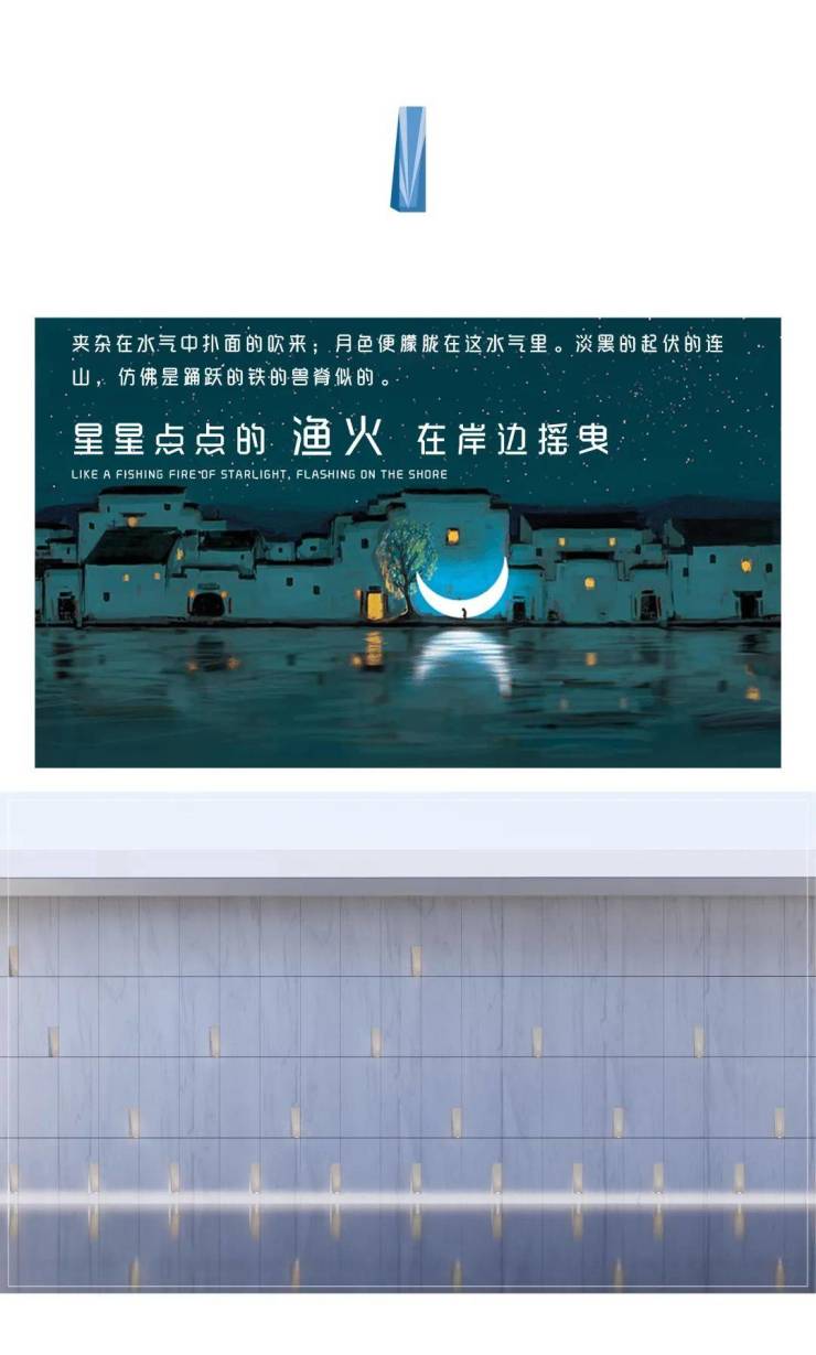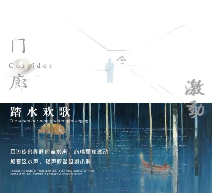 利用故事中的“戏前期盼”的场景元素:整个展示区的灯光就仿若航路上的灯塔,远远看到朦胧的灯火闪烁,怀揣期待的心情走近故乡里的绍兴。