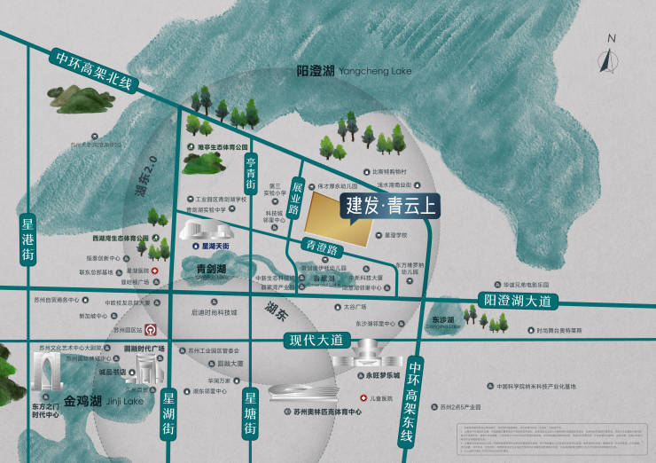 活力封面的青剑湖、生态休闲的阳澄湖、都会生活的翡翠湖交织湖区的日常,约1km直抵阳澄湖湖滨生态体育公园、约500m直抵翡翠湖生态公园、唯亭公园、仙樱湖公园、莲池湖公园,以生态宜居为特色给园区一个置业新主场。