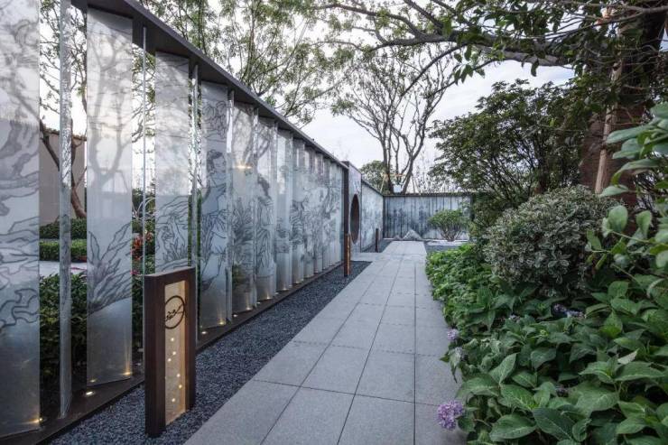简洁、舒朗、怡然自得的生活情趣意味在后场空间的组织里展现得淋漓尽致,将地域、古典文化融入住区中,打造一处富有地域特色的景观。售楼处后场对景墙采用“比翼鸟”羽毛的元素,在空间进出有限的条件下,设计师运用简单的线性元素勾勒出一面立体照壁,羽毛、光影、灯光的组织,一实一虚,使得整个空间洋溢出大气、雅致的气息。