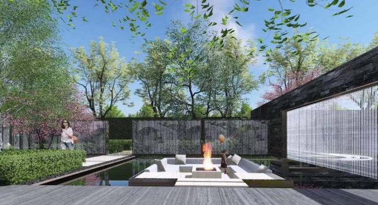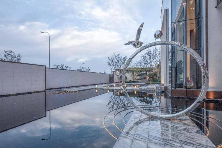 沿着入口来到中心水景花园空间。设计师借鉴“桥式”景观步道,打造滨水小径;镜面水中星光点点,夜间漫步于此,犹如漫步星空;于水景中植一株迎客松,树下水面晕开涟漪,尽显“简臻”韵味;“比翼鸟戒指”雕塑立于水面,水中喷雾蔓延,沿着其平静宽阔的水平面眺望, 让人拥有一种置身仙境中的错觉。