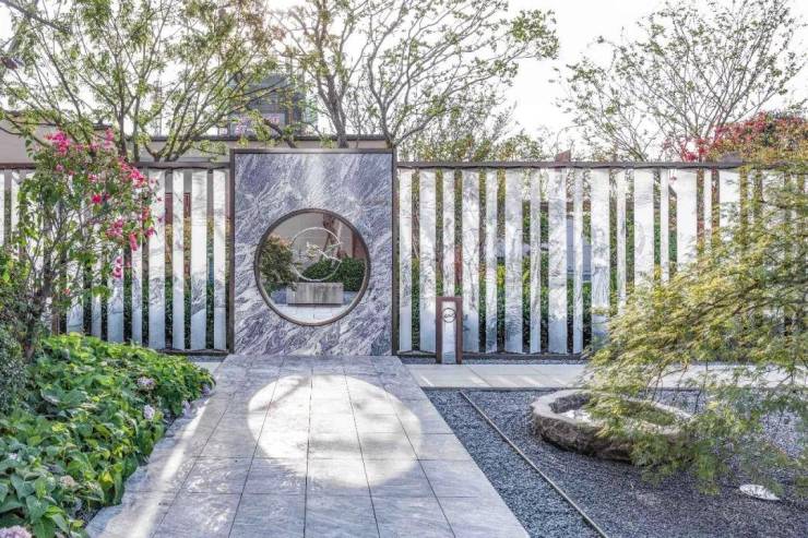 蕴藏礼序的宅院始于“门第”,府门雅致大气,立面文雅而富有细节,景观色泽与材质上力求与建筑呼应,隐贵于形。至入口,开门见山,入眼便是一圆形水帘,俯瞰水帘,池底“七姑星”灯极具震撼。过水帘,一幅“七仙女下凡图”跃然在眼前,惊喜不断。