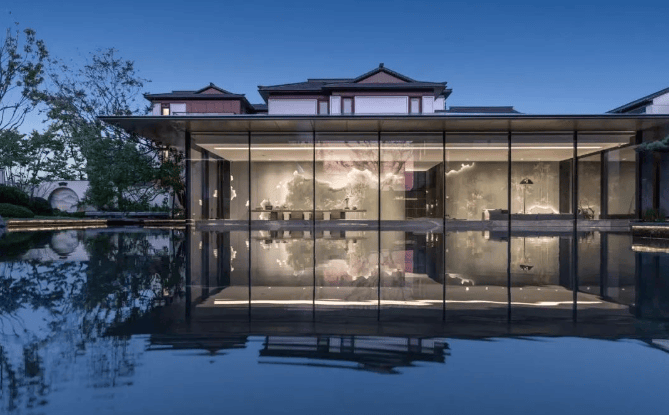景观规划:中央景庭由合院区两大水院意趣相融而成,在低密住区中打造罕见的双中心水院,与晶莹剔透的现代玻璃建筑相映成趣,临水观照,逸趣自生。三进院落归家尊仪,一进长巷渐舒,层林浸染;二进松瀑石涧,四水归堂;三进纳湖入院,碧波粼粼,层层叠进彰显当代名门大家之仪。还有 “看松读画轩,月到风来亭” 等浮水为台、观水为亭、依山为榭的亭台水榭胜景,以碧波浸亭,陶公钓矶、颐乐茶室等写意当代东方的人文清雅 。