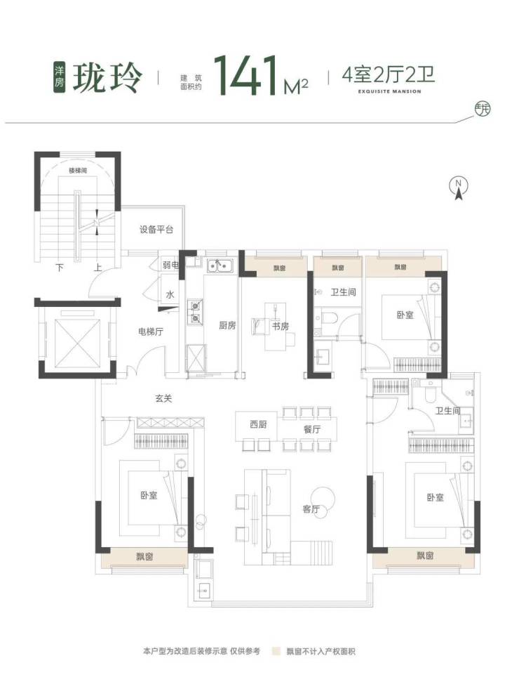 洋房:建筑面积约141㎡ | 4室2厅2卫,一梯两户/南北通透/双开间阳台/豪华主卧套