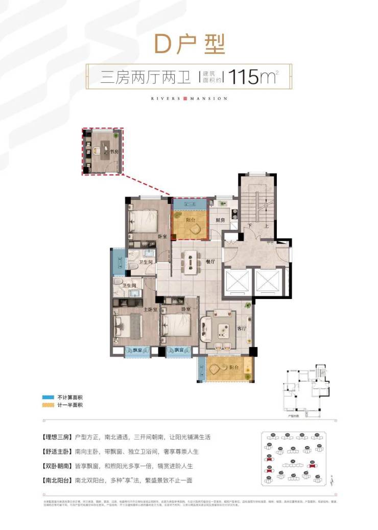 特别是前江上城建面约115㎡理想三房,户型方正,北阳台可拓展改造为书房,享受更高的得房率和江畔生活的美好温馨。三开间朝南,让阳光铺满生活;南向套房式主卧,带观景飘窗、独立卫生间,奢享尊崇人生;南北双阳台,多种“享”法,繁盛景致不止一面。