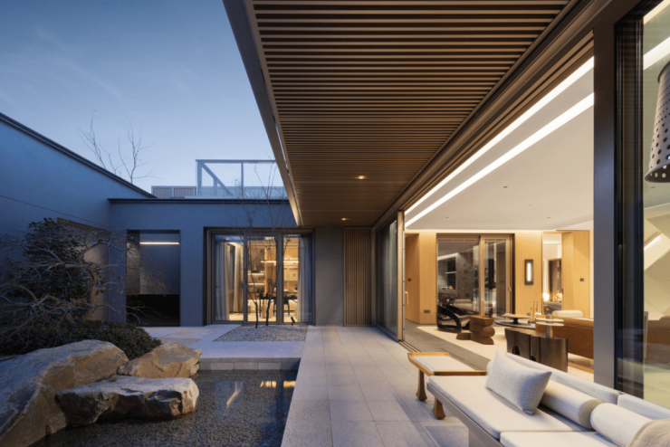 一房一院一景,观天地,观万物,观自在。有别于传统别墅“围合式”花园,“前庭后院”设计,前庭四水归堂,后院流水景墙,将建筑空间向自然全景打开,安坐家中,仰天察地,静观飞鸟流云、四时晴雨,顿悟内心。