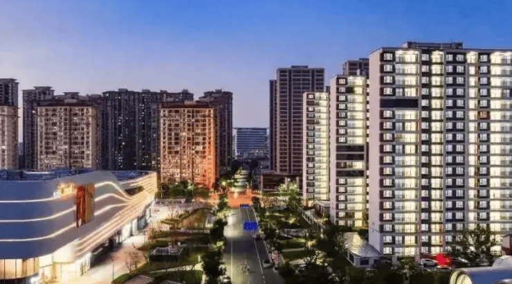 现代简约滨水风格,外立面以浅色系涂料 + 玻璃为主,线条简洁;社区内部有中轴水景、阳光草坪、林下休闲区、滨水步道;双水系环绕,步行可达迪荡湖公园,景观与水系融合,日常散步舒适;人车分流,保障老人小孩安全。