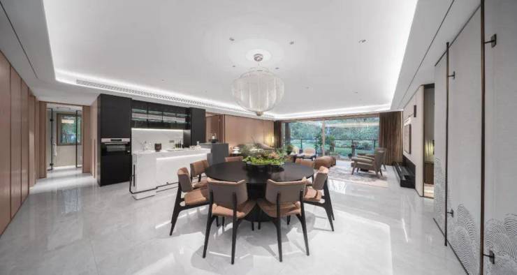 餐厅、客厅、厨房、阳台空间融为一体,形成了一个超大尺度空间,中式厨房与西式岛台完美结合,让多种美味得以自在切换。
