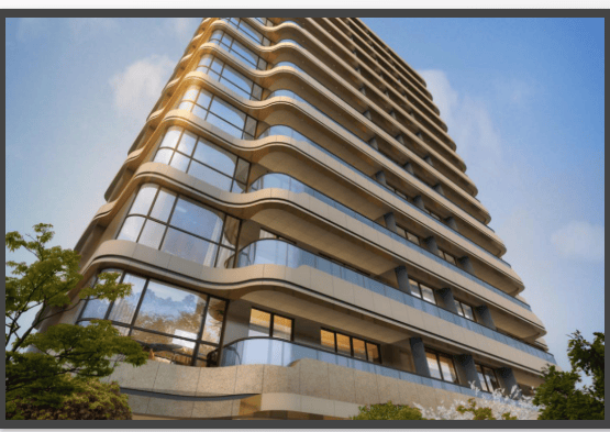 建筑风格:流线型现代风,大面积镜面玻璃 + 金属铝板外立面,景观由美国易顿设计 “七彩凤林” 七重空间,水系与绿地交织