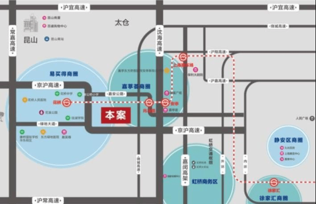 通过11号线可快速通达上海国际赛车场、上海汽车城、上海西站、虹桥高铁站、虹桥国际枢纽,约35公里可到达中山公园、静安寺、淮海路、约40公里可到达南京路、人民公园、浦东陆家嘴金融中心。从时间距离来看,可以享受上海的城市配套。