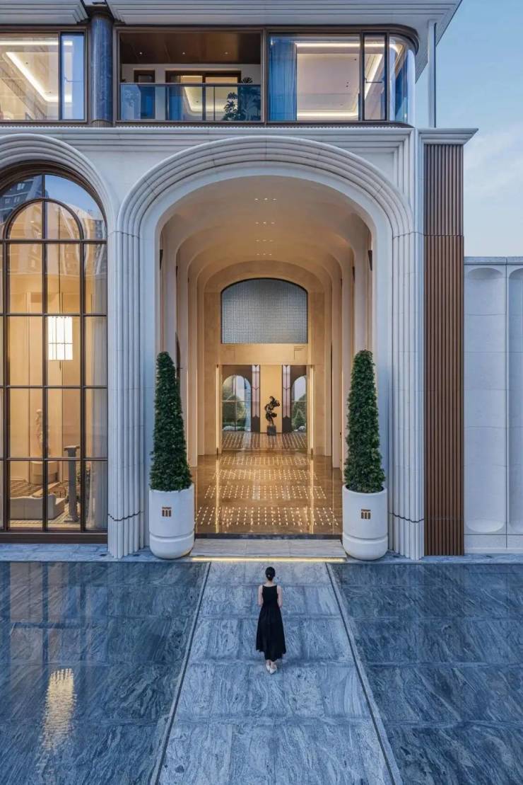 建筑设计:九米设计,意式文艺复兴美学,外立面为石材 + 铝板 + 大面积玻璃;景观由卓时设计,垂直取景器立体园林、光影水苑、漂浮花园;配套约 1000㎡四大主题架空层会所(行政酒廊、图书馆、健身、疗愈区)。