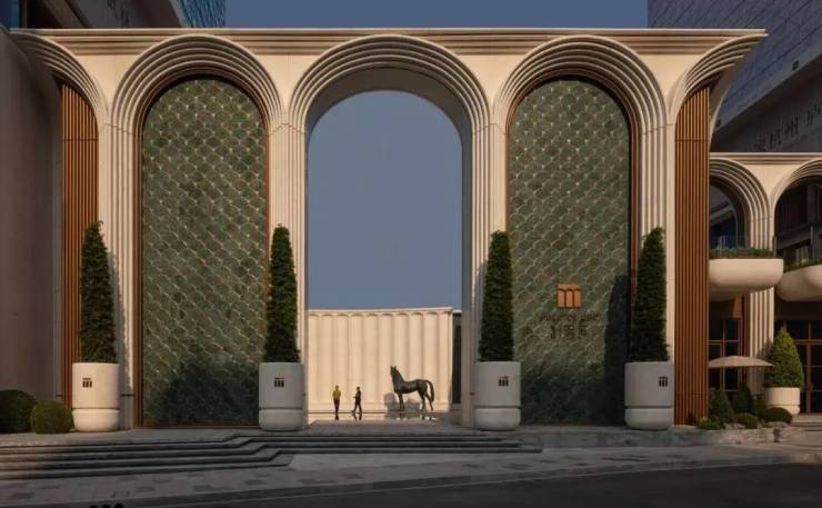 规划指标:4 幢 12–17 层小高层,仅 96 户;容积率 2.4,绿化率 35%;全抬地设计(首层离地约 12 米),标志性 12 米高拱券主入口;