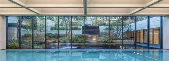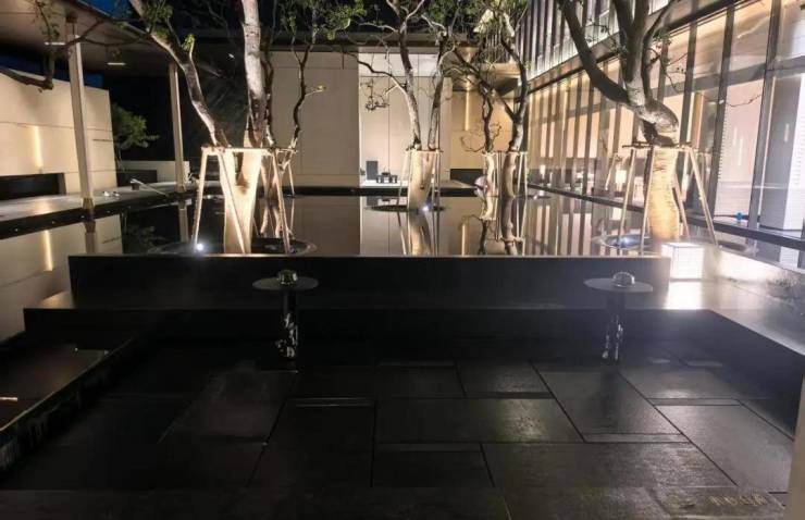 悬崖会客厅廊架地面采用安哥拉黑 3.6m×1.8 m×0.3m 大板铺贴,施工难度极大,需 8 人协作抬运并配合机械作业,最终呈现出大板面的优质效果。会客厅廊架采用昂贵蜂窝不锈钢大板,大气且保证平整度,以高品质材质与精湛工艺,进一步提升空间的质感与格调。