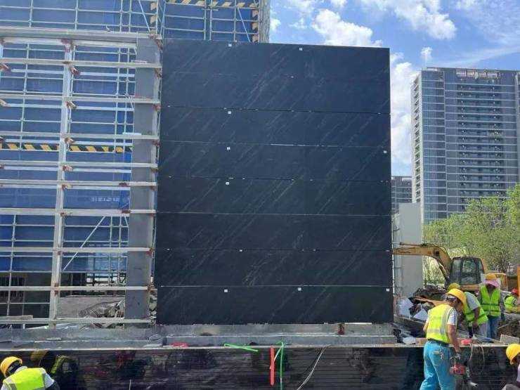 石材拼接严谨细致,反复筛选每块石材毛料,确保纹理走向、色泽深浅高度契合。拼接时严格遵循对纹原则,让自然纹理形成连贯整体,无生硬断层。 针对 “翠谷幽兰” 奢石的干挂操作,从前期预摆调整、核对拼接精度,到正式施工时的精准操作,细致把控。奢华感与神秘感随石材本身的纹理、干挂的利落质感自然流露。