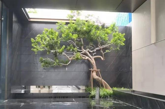 为打造入口门庭的归家仪典感,百绿采购团队悉心甄选七株铁冬青:两株主景冠形饱满、长势健硕;五株辅木源自山野,风骨遒劲。它们以对称布局对映成景,勾勒出“五福临门”的吉祥格局,增添四季常青的生机。以山林意象为主题的营造景观,使业主从踏入大门开始即可感受到奢雅的生活氛围。