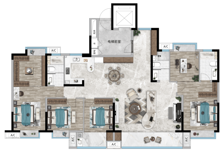 五开间朝南,全明通透设计,超20m阳光版图的奢阔尺度,实现全家庭成员的阳光自由。双主卧、双次卧、客厅均沐浴在自然光中,超50㎡LDKG全景社交厅堂,约6.7m开间,厨房、餐客厅、阳台无界联通,三代同堂的欢笑与孩童成长的轨迹皆在此从容流转。
