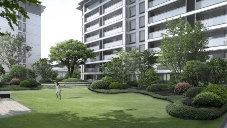 现代东方风格,底部石材干挂 + 大面积 LOW-E 中空玻璃,线条简洁大气;三面环水,直面洋泾湖公园约 4 万方绿地,社区内有阳光草坪、儿童乐园、健身区、架空层泛会所;约 1500 米滨河步道,人车分流,滨水视野极佳,日常散步慢跑舒适。
