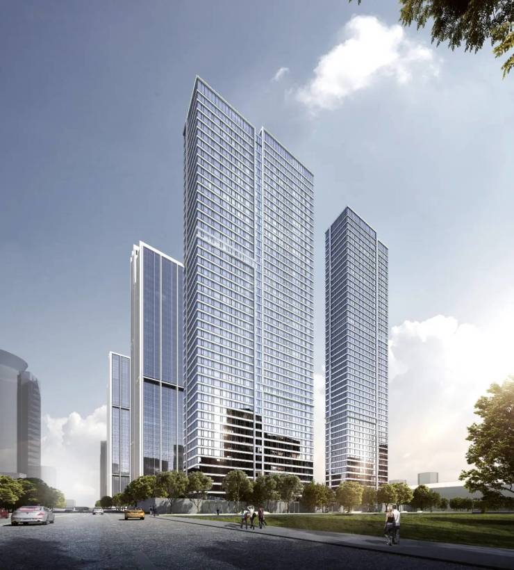 楼栋规划:包含 2 栋住宅大平层、超 5A 甲级写字楼、康莱德酒店、滨水商街及公寓。