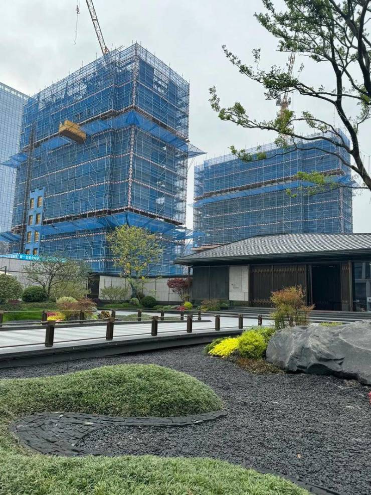建筑风格:采用现代新中式风格,外立面采用三面铝板 + 香槟金飞檐,南向斜切 45° 铝板勾勒极简横屏效果。主入口是 34 米宽仪式大门 + 太湖石雕塑,中央有 1.2 万㎡云起湖景公园,最大楼间距超 60 米。
