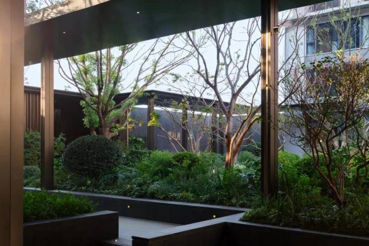 视线越过大门,随即映入眼帘的是模拟“高山流水” 自然美景的中庭景观,中式园林的调性结合现代简约的演绎手法,东方情怀就此被安放于国际化的建筑语言之中。