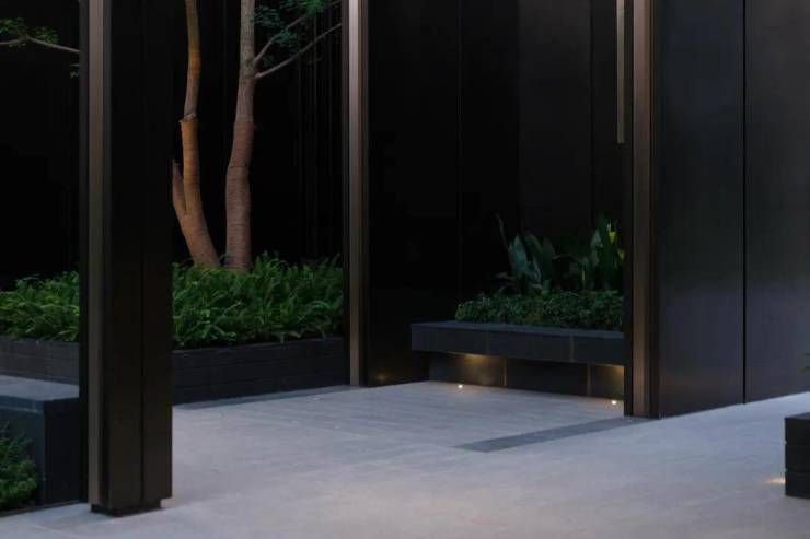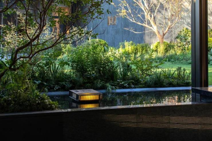 通过将植物和流水融入几何体中,各个景观要素创造了丰富的空间层次,并逐渐开始显示出一种更高阶的品质感。流水潺潺,层层叠叠,丰富了视觉感受与变化。