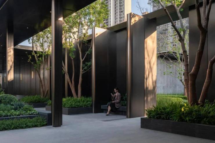沿着连廊再往东是半私密的社交空间,这里适合三两伙伴小聚交谈。结合连廊利,用植物与景墙围合塑造出多个休憩空间,同时让每个空间都面向核心花园,体现景观价值的最大化。