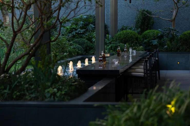 吧台融于翠色之中,相互渗透,涌泉与灯光起舞跳动,为松弛慵懒的场景增添了一份趣味。
