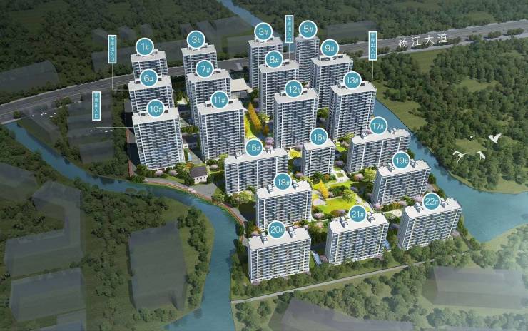 建筑风格:采用现代美学立面设计,以简约线条与质感材质勾勒建筑轮廓,20 栋建筑北高南低排布,可一揽水岸风光与树人大学风景。