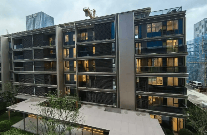 现代轻奢立面 + 精装高配:金色框线 + 云冠造型,大面玻璃 + 铝板;精装配博世厨电、汉斯格雅 / 杜拉维特卫浴、中央空调、地暖、新风,标准约 2500 元 /㎡。