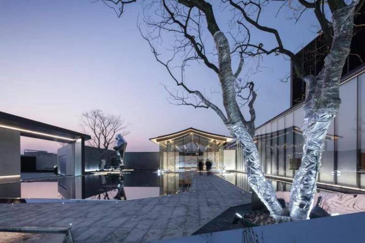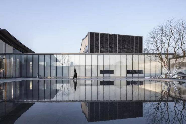 景观门楼既是入口,也是前场的景观连廊。步入连廊,一面内置水乡特色山水绢画的U玻景墙展现在人们面前,水墨韵味满盈。