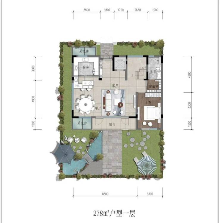 中央园林假山高立,跌水飞瀑,水流向西北、西南落下,男女主位兼顾,事业财富双收。