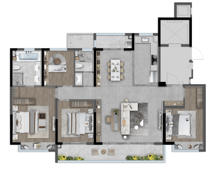 4.5开间朝南,搭配大玻璃幕墙,更宽阔的采光面积,让每个房间尽可能多的获得光的眷顾,以明厅、明卧、明厨、明卫,给予视觉更加通透大气的感官,光线与空间的交互。