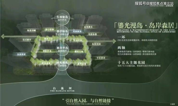以“山水聚场”理念,规划“一环两轴十五园”景观布局,将水岸、岛屿、森林、花园、树屋作为园林节点,形成“行在景中、坐在岛中、游在林中、意在境中”的美学表达,营造出沉浸式山水活力场域。