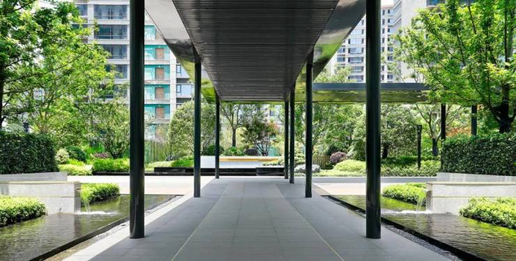 从归家伊始,美好画卷便徐徐铺展开来,漫步迎宾风景大道,耳边是艺术水景的潺潺之音,举目所见,则是不同名贵树木构成的礼仪树阵,如罗汉松、朴树等错落有致,让回家如同穿越风景的漫旅。