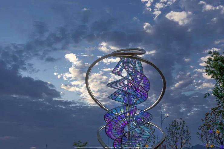 雕塑提取浪花元素,捕捉海浪的运动和力量状态,并将其静态化,展示了灵动的浪花形态,以及浪花在光线下呈现的渐变色彩,完美展现了海洋之美。