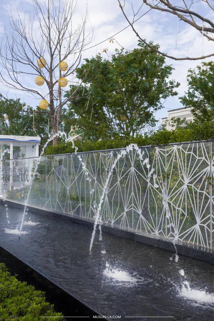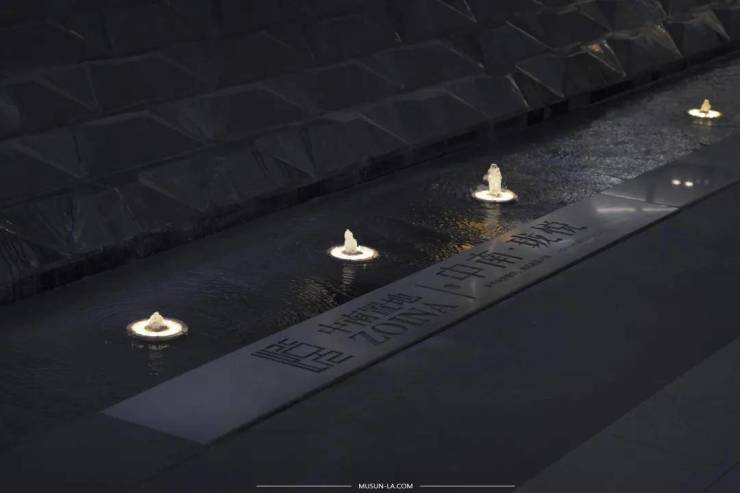 示范区的入口水景提取光的元素,将光在海底自由渗入所组成的点、线、面抽象提取,运用于玻璃板上,让人在恍然中忘记空间的存在。