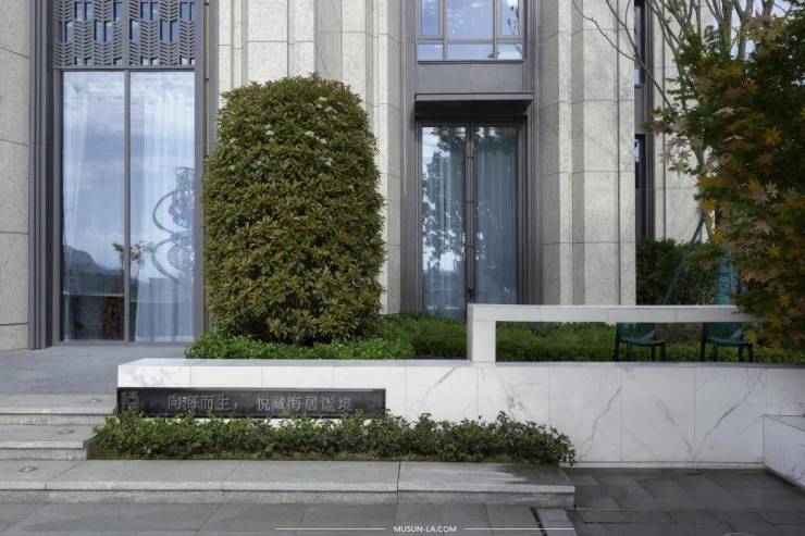 头门港海岸,潮水拍岸,海风清爽,幽深而富饶的海洋世界,寄托着许多人的自然情结。我们将来自大海的灵感运用在铺装之上,将蓝色领域的气息引入珑悦府。海水拍打出的浪花呈现着灵动的形态与多变的色彩,示范区铺装延续了海浪的渐变性和流动性,简化了海浪的复杂性。