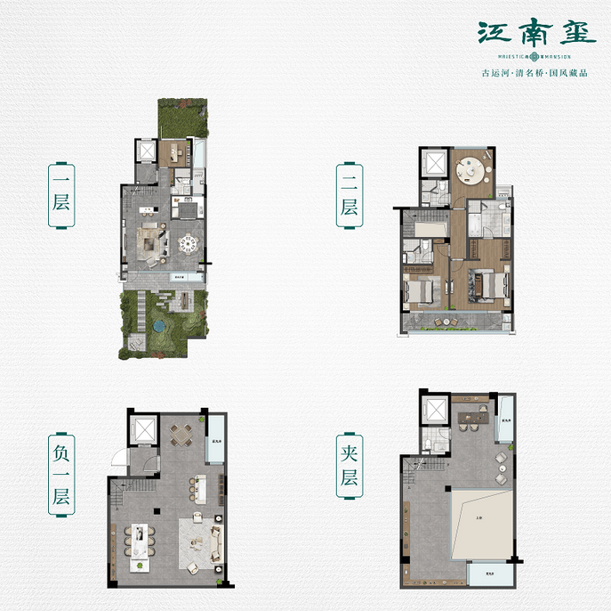合院采用四合院的形式,围绕中央景观分为独门独户的几栋,确保每一栋的私密性。合院为两层,地下室不计入产证面积,且可以选择隔为两层。一层客厅餐厅,二层是卧室休息区,而地下室可以选择设置宴客厅、棋牌室等休闲娱乐场所,生活与娱乐互不干扰,地下室还带有车库。
