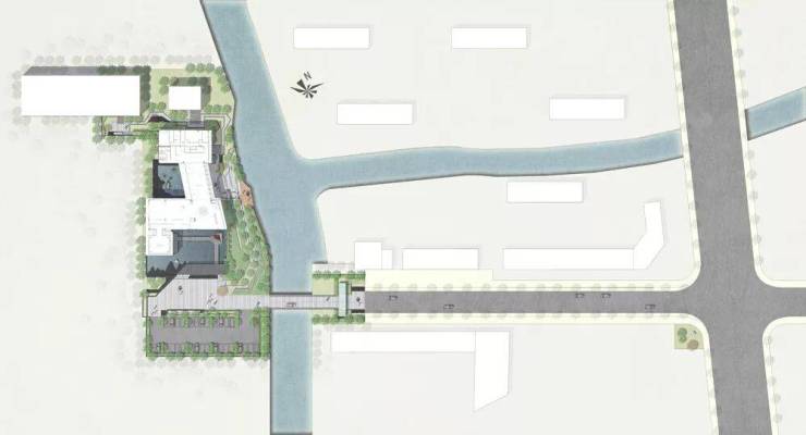 穿过大型玻璃构筑,走进前场。门楼前开阔的广场,昭示了元垄·华著“现代化、城市化”高端楼盘的定位。穿过西周直江上的景桥,即可看见景观水帘,水流淅淅沥沥地流淌,灵动悦耳,与简约的门楼相互映衬。踏上台阶,超大水面映入眼帘,水中倒映着简约现代、充满绍兴特色的销售中心建筑。