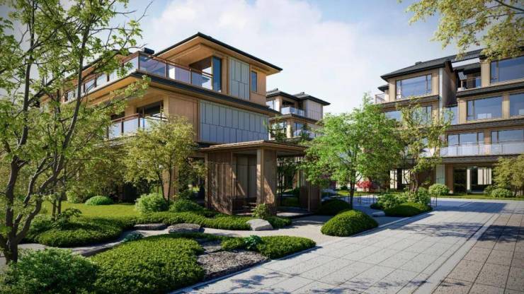 建筑特色:容积率仅约 1.15,为低密社区。建筑采用宋韵美学风格,由 gad 集团合伙人蒋愈设计,以木色铝板与灰白色石材打造立面,尽显东方韵味。