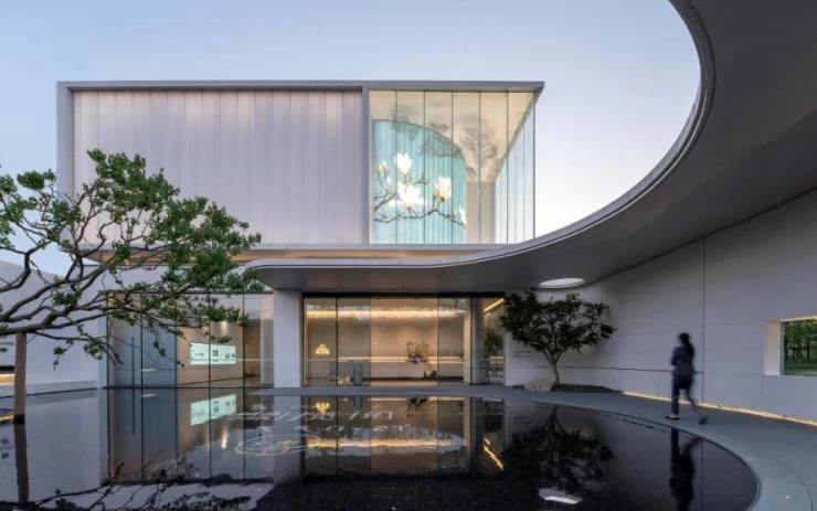今天,地产建筑设计的市场环境日趋严苛,在高速周转的市场运作状态下,风格,客户,产品附加值等等语汇频率越来越高。招商“美学系”就诞生在这样的语境之下。在美学系的第一座落成项目 -- 上海浦江招商揽阅,因地形局促,促使我们思考将建筑的内在之美外显,以美学之长,补前场空间之短;以表达上的简约手法,揭示项目品质的纯粹与珍稀。传统示范展示区强调松弛感,开阔水面或密林叠嶂。而揽阅的庭院是相对封闭内向的。从室外空间铺陈上,观者的视线往往落在花窗之外,边庭之间,有意犹未尽感;而在室内部分,参与者视线的营造更趋于集中,类似于橱窗陈设,目的性和戏剧性更强烈。在主题视觉中心之外,刻意的大面留白,以缓释视觉上的紧张。