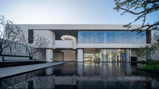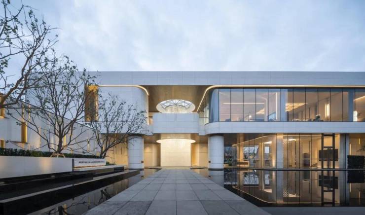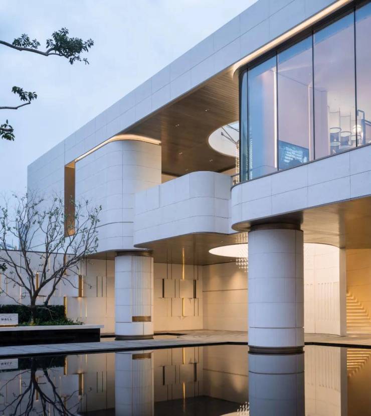 托举起的二层体量,简洁的水洗面贝金米黄石材,留出大面的玻璃幕墙朝向于水面景观,轩楹高爽,窗户虚邻;纳千顷之汪洋,收四时之烂漫。用大面而纯净的材质和纯净的光影关系来素描建筑的体量,用圆和方最基本的母题,内与外相互投射的拓扑关系,来形成戏剧化的视觉焦点,用精致的型材收边勾勒细节。除此之外,计白当黑,落墨谨慎,无画处皆成妙境。