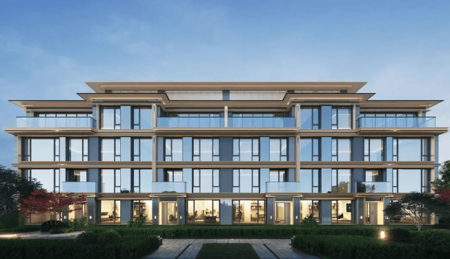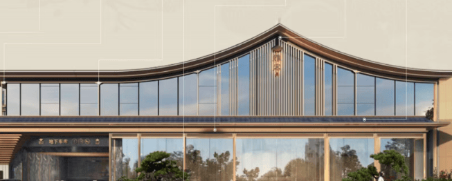 建筑风格:项目为新宋风美学立面,从《营造法式》中提取转译复刻中式重檐、凤尾悬鱼、格子挂落、交绞造等一系列代表性宋韵建筑元素,运用宋代天青汝窑的金边工艺,同时结合当代审美,以铝板、云纹铝板、质感石材、LOW-E 玻璃等现代化材料,辅以金属格栅重新演绎,提升建筑的腔调和质感。