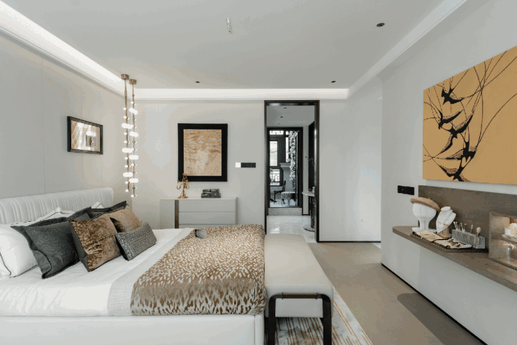 随后,嘉宾们步入样板区。在由外模环绕营造出的如梦如幻的梦境花园氛围里,悠扬的大提琴声缓缓流淌,为整个样板区增添了优雅的艺术气息。紧接着,众人移步至样板房,得以一窥「江山」美墅的真容。